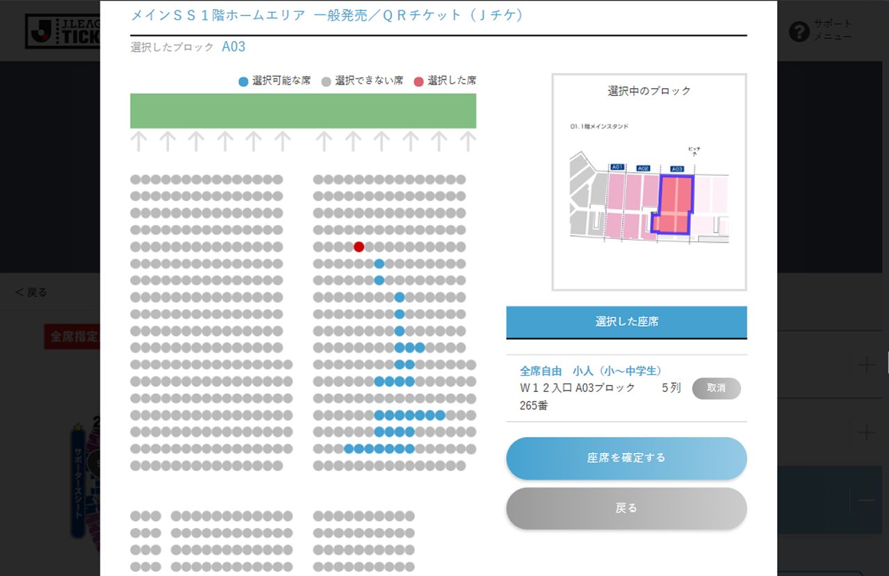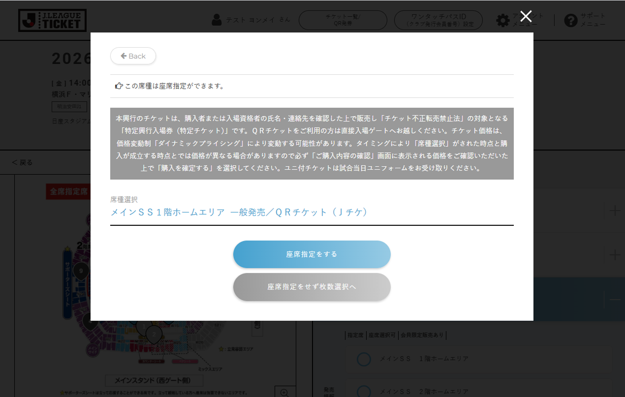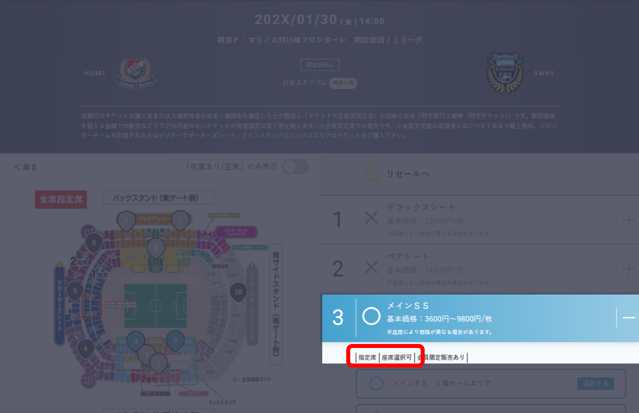 座席指定が可能な試合では、試合選択時もしくは席種選択時に座席選択可と表示されます。
