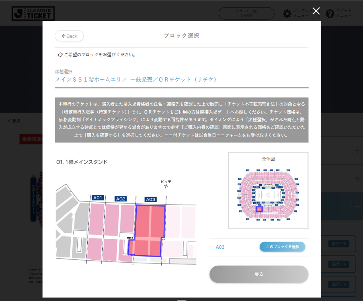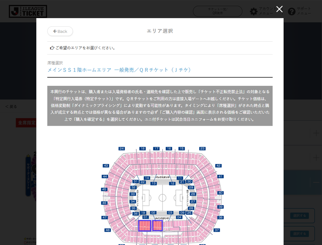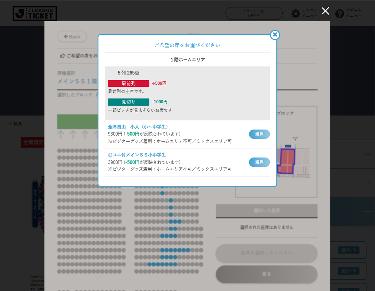 座席指定が可能な試合では、試合選択時もしくは席種選択時に座席選択可と表示されます。