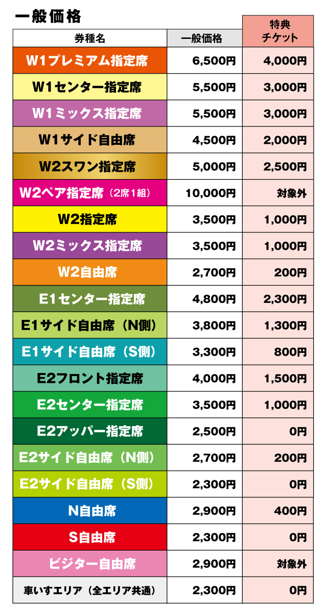E2アッパー指定席、E2サイド自由席(S側)、S自由席は0円(ご招待)、その他席種はご優待となります(対象外席種あり)。