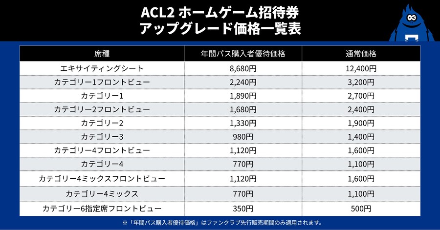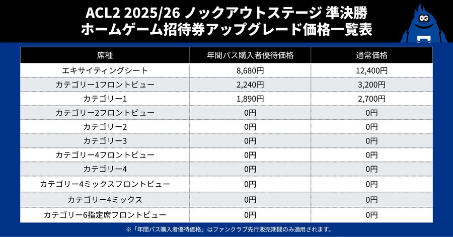 ※2025/26シーズンAFCチャンピオンズリーグ2(ACL2)ファンクラブ会員対象「ホームゲーム招待券」では対象席種および金額が一部異なります。